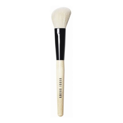 Dip into powder and lightly tap to remove excess. Use the flat edge to sweep powder all over the face. Add highlighter or bronzer to high points of the face, like the cheekbones, nose, chin, and forehead, with the tapered edge of the brush.