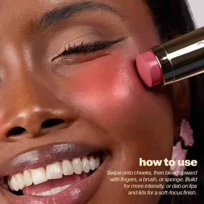 Glide the stick directly onto the apples of the cheeks and gently blend up towards the temples for a healthy pop of colour. For a more subtle application, swipe your fingers, brush, or sponge over the tip of the stick first, and then bounce onto the cheeks for a more diffused look.