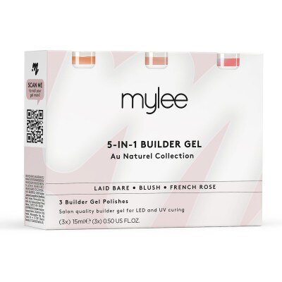 To strengthen, brush on 2-4 very thin layers of Mylee 5-in-1 Builder Gel, curing each layer for 60 seconds. To build extensions of up to 1cm, attach a Mylee Paper Nail Form* and brush the Builder Gel over the entire nail, extending the tip, and cure for 60 seconds. Repeat this step to build a strong extension.