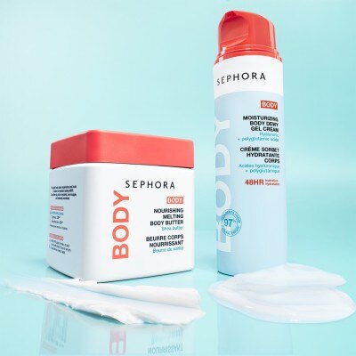 The Nourishing melting body butter has a rich, cocooning texture that intensely nourishes and helps repair the driest areas, while providing 48 hours of hydration. The Moisturizing body dewy gel cream, with its lighter sorbet-like texture, delivers instant hydration without a greasy finish—perfect for 48 hours of refreshing moisture and everyday comfort.